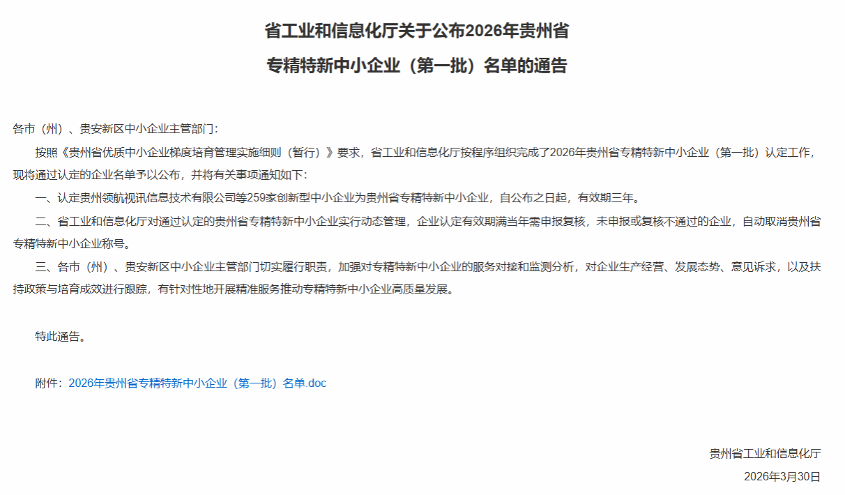 3月30日,贵州省工业和信息化厅正式公布2026年贵州省专精特新中小企业(第一批)认定名单,中建材贵州勘测设计工程有限公司(贵州勘测)凭借在地勘领域的专业化深耕、精细化管理、特色化创新与高质量发展,成功入选并荣获 “专精特新中小企业” 称号。这是公司继获评国家高新技术企业、科技型中小企业、创新型中小企业后,再获权威资质认可,标志着公司在细分领域的核心竞争力与创新实力迈上新台阶。